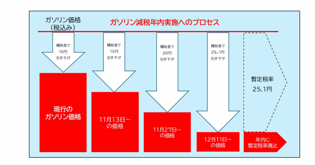 - 正式施行までは段階措置:11月中旬〜年内は補助金で実質値下げ→税率廃止へ移行。